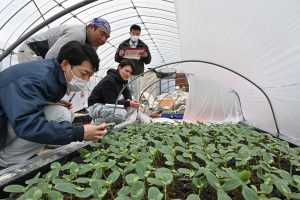2月17日は、愛知県豊田加茂農林水産事務所農業改良普及課職員やJA営農アドバイザーらが豊田市上原町や御船町、亀首町などにある部会員の育苗ハウス5カ所を巡回しました。病害虫の有無やハウス内の温度・湿度を確認し、今後の栽培管理などを指導しました。現在の生育は部会員の適切な栽培管理でダニやアブラムシなどの害虫被害もなく順調です。農業改良普及課の小竹博之専門員は「活着など順調に生育している。今後育苗トンネル内の温度や乾燥に気をつけて管理してほしい」と話しました。今後は、3月下旬に定植後のほ場巡回を行う予定です。