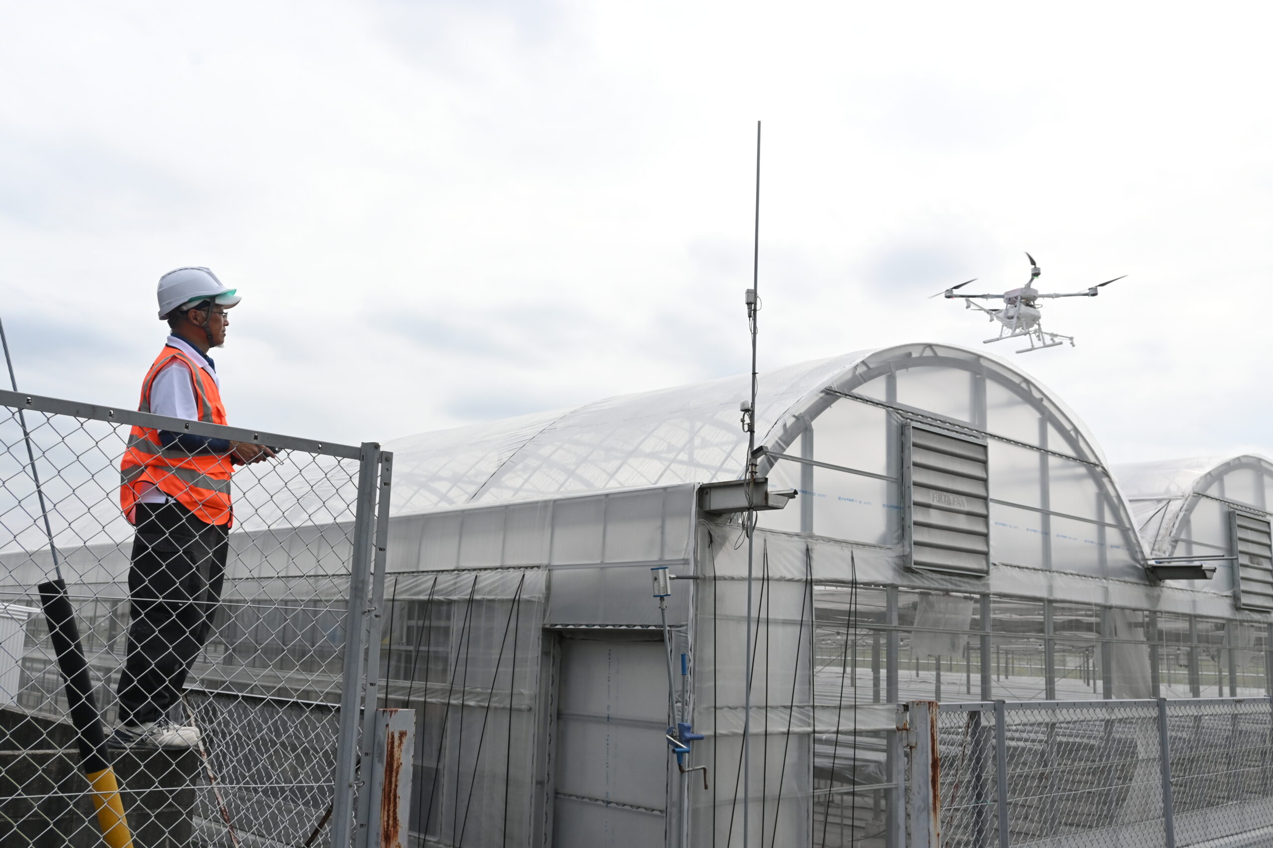 JAあいち豊田いちご部会に所属し、豊田市汐見町でイチゴのビニールハウス栽培をしている永田岳志さんは9月25日、自身のビニールハウスへドローンを使った遮熱剤散布を行いました。通常人の手が届かない天井部には塗りにムラができてしまうことが多いですが、ドローンの活用でムラのない塗布が期待でき、作物の高温障害や農家の暑さ対策に繋げることができます。ドローンの操縦は京都府に本社を置く株式会社ラッキーリバーが行いました。