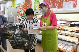 この日はJA女性部三好支部さとうの会の4人と同JA組合員振興課の職員が参加し、来店者と会話を楽しみながらレシピを手渡しました。レシピを受け取った来店者は「旬の食材を使ったレシピが載っていてうれしい。サツマイモを煮た料理は今までしたことがなく、面白そうなので試してみたい」と話しました。同支部のさとうの会の久野ひとみさんは「高齢で一人暮らしをされている方などに、人や地域との繋がりを持ってもらいたいと思い活動している。利用者とJAとの繋がりも大切に、利用者の声を積極的にJAに伝えていきたい」と話しました。