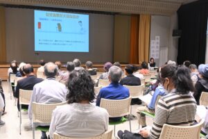 JAあいち豊田年金友の会下山支部は10月10日、健康管理についての知識を学ぼうと豊田市大沼町にある下山基幹集落センターで「健康教室」を開き、同支部の会員56人が参加しました。