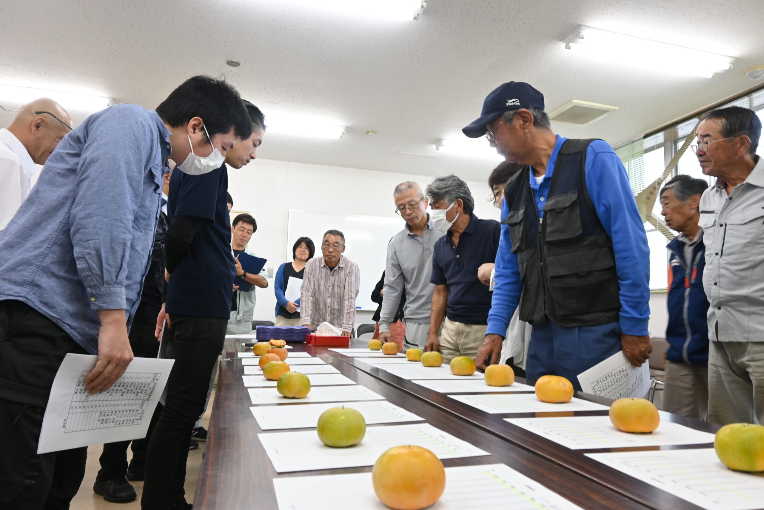 この日は、部員やJAあいち経済連、市場関係者、JA職員ら合わせて25人が参加。市場情勢や他産地の果物の情報を共有した後、部員が持ち寄った柿を手に取って着色度合いや糖度、食味を確認して出荷規格などを共有しました。同組合共撰柿部の太田孝司部長は「規格をもとに、レベルの高い状態の柿を出荷していきたい」と話しました。またJA職員は、収穫時に伴う高所作業のリスクを減らすための樹形改造の案内やカラス対策に木綿糸を使うことなどを提案しました。