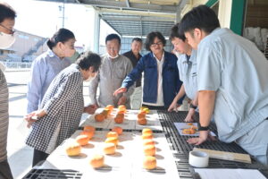 この日は、部会員と市場関係者、JAあいち経済連、愛知県豊田加茂農林水産事務所農業改良普及課、JA職員ら合わせて19人が参加。市場情勢や他産地の果物の情報を共有した後、部会員が持ち寄った柿をサンプルに食味を確かめ、果径や赤色などの出荷規格を統一しました。JA柿部会の梅村釼二部会長は「今年は残暑の影響か色づきが例年より遅れているが、カメムシの被害は少なめ。発生があれば防除を行い、品質のよいものを出荷してほしい」と話しました。同農業改良普及課の山本三鶴主任は「カイガラムシの発生にも注意してほしい」と呼びかけました。