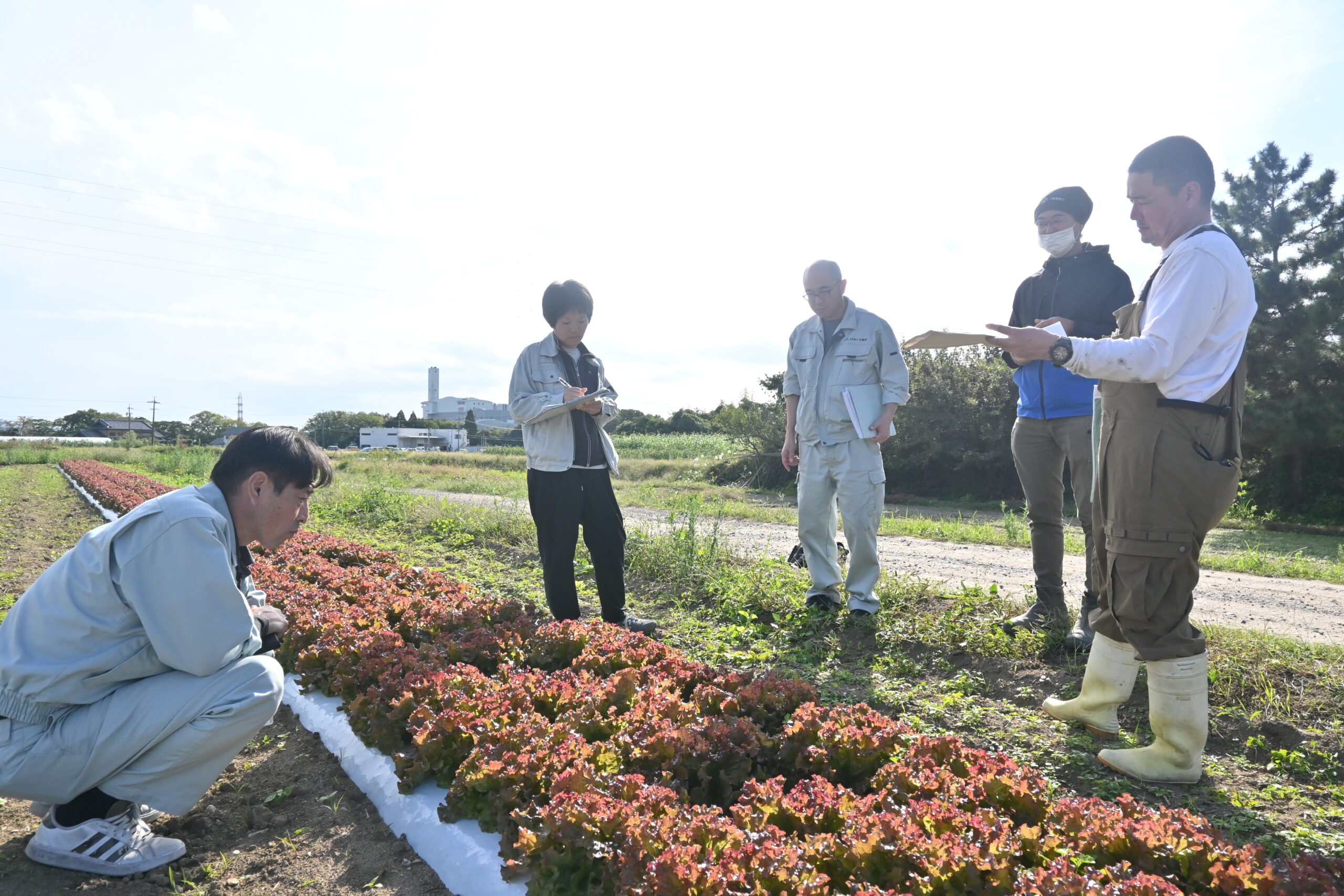 29日は、JA職員と愛知県豊田加茂農林水産事務所農業改良普及課職員、新入部会員ら合わせて4人が部会員のほ場3カ所をまわりました。チョウ目類の害虫やアブラムシなど苗につく害虫の有無や葉の色などを確認し、質の高いサニーレタスを出荷できるよう部会員と今後の栽培方法を話し合いました。また、同行した新入部会員は先輩部会員らに使用している肥料やかん水の頻度などを積極的に質問し、「かん水が大事ということが改めて分かった。特に定植直後にかん水をしないと、その後の生育に大きく差が出ることを実際に見ることができた」と話しました。今後は11月13日に目ぞろえ会を開く予定です。