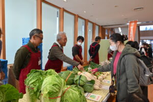 JAあいち豊田と豊田市が共同運営する農業研修施設「豊田市農ライフ創生センター」の研修生が11月20日、豊田市西町にある豊田市役所東庁舎の1階ロビーで販売実習を行いました。これは同センター担い手づくりコースの2年目のカリキュラムの一環で、農産物を販売するノウハウを学び消費者との交流等を体験することが目的です。