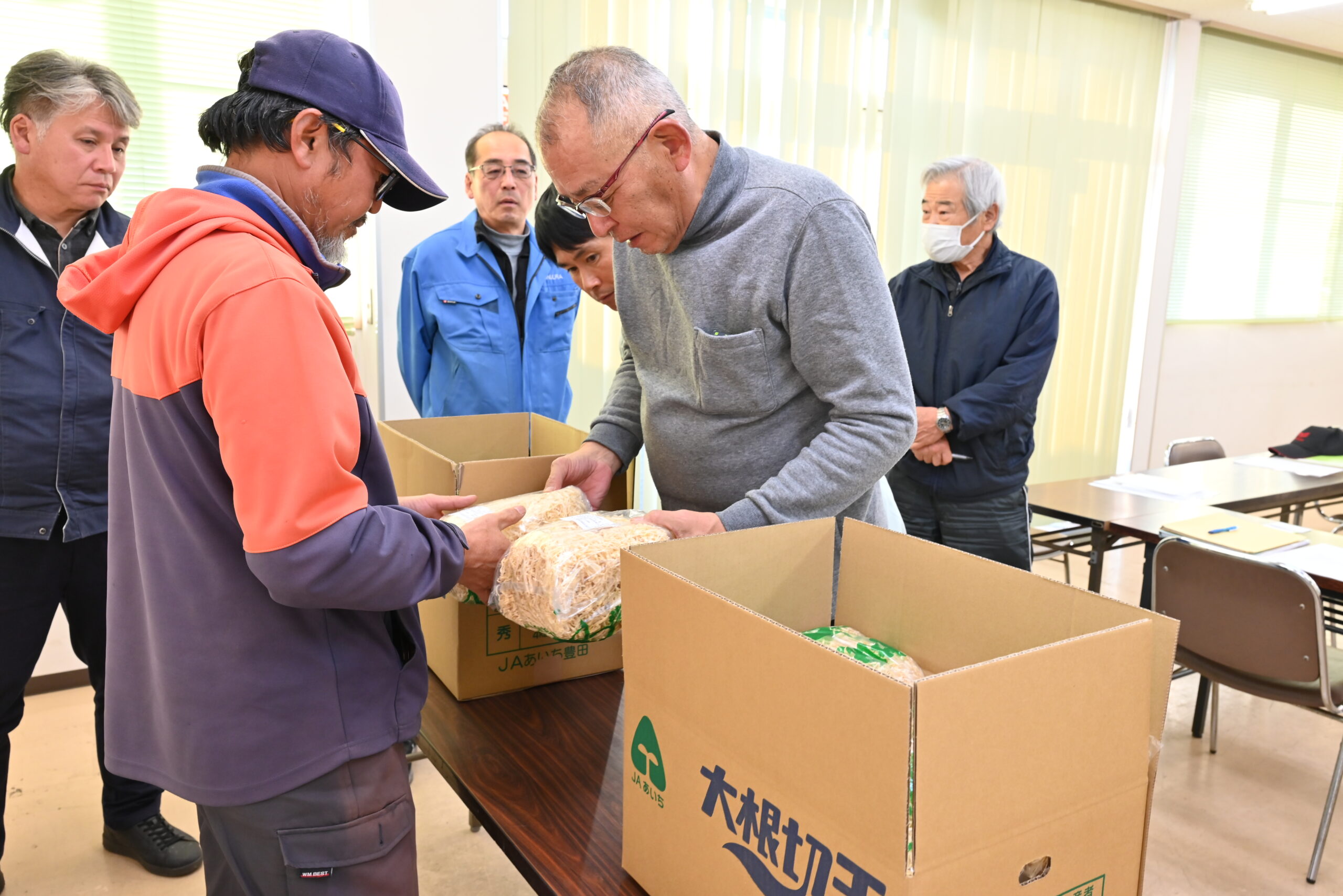 この日は、部会員をはじめ市場関係者やJA職員ら合わせて12人が参加しました。市場情勢や他産地の野菜の情報を共有した後、出荷規格をあわせるため、部会員が持ち寄ったサンプルの大根切干を基に、形状や色沢などを確認しました。また、加工途中や袋詰め作業時に起きやすい異物混入に関する注意点を確認しました。みよし市蔬(そ)菜園芸連合会秋冬作部会の光岡公利部会長は「みよしの風物詩とも言える大根切干。品質の良いものを作り高値で買ってもらえるようにしよう」と話しました。