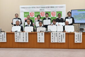 式には、JAの石川尚人代表理事組合長をはじめ、医師や弁護士の団体、豊田市社会福祉協議会など13団体の代表者10人と太田稔彦豊田市長が出席した。太田市長が、市民一人ひとりが幸せを感じられる社会を「ともにつくる」ことなどをうたった共同宣言を読み上げ、出席者が協定書に署名しました。JA石川組合長は「さまざまな事業で組合員と接する中、身寄りのない高齢者の問題は肌で感じている。この締結が豊田市の問題解決の一助となるよう誠心誠意取組みたい」と話しました。