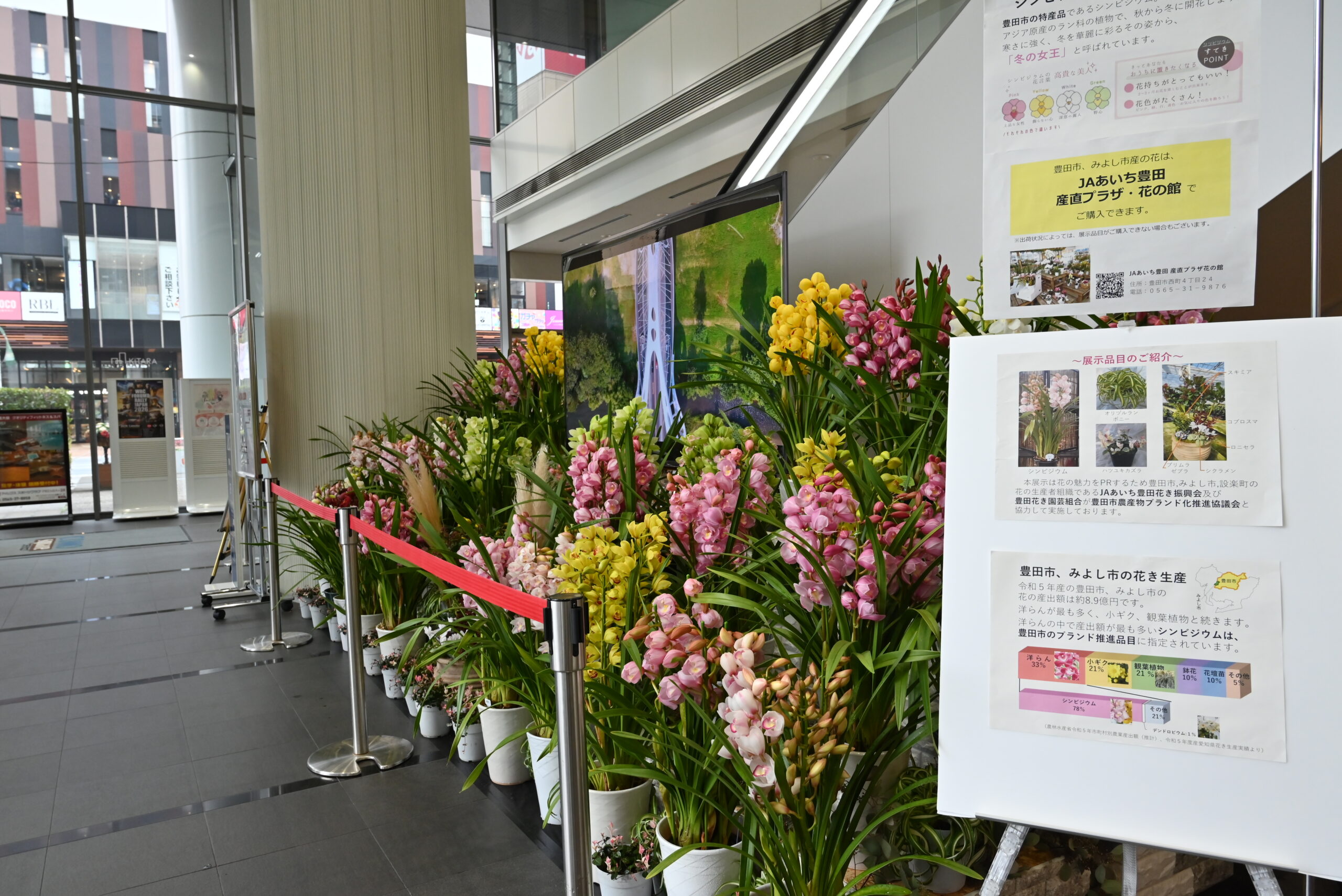 豊田市ブランド化推進協議会と豊田花き園芸組合、JAあいち豊田花き振興会は、名鉄豊田市駅近くの豊田市喜多町にある商業施設「コモ・スクエアWEST」の1階エントランスで「ウィンター・プリンセス プロジェクト」と題し、1月26日まで花の展示会を開いています。豊田市やみよし市で栽培したシンビジウムなどの洋花や鉢花を展示し、同施設に訪れた人々の目を止めました。