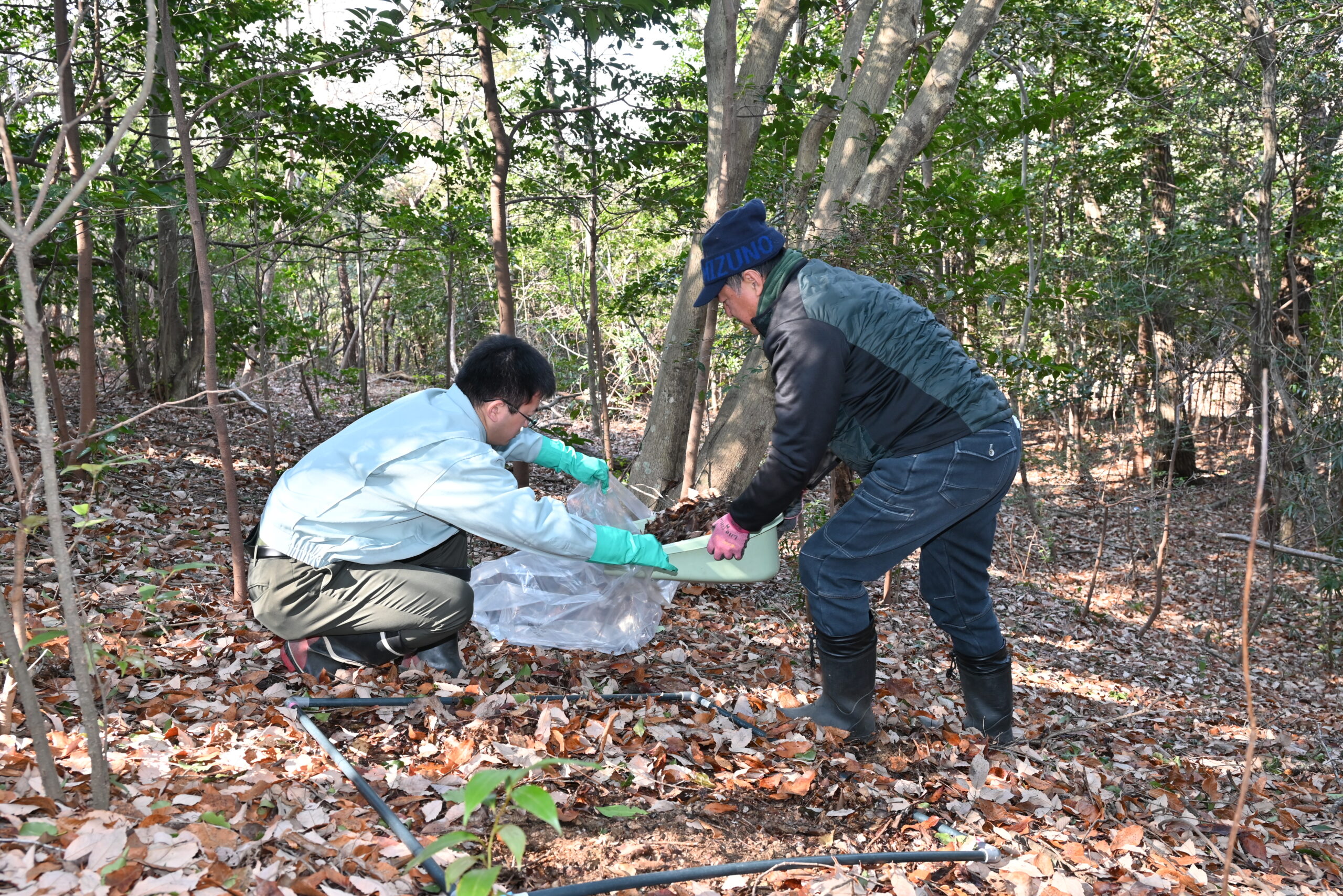 写真=落ち葉や腐葉土を採取する職員ら