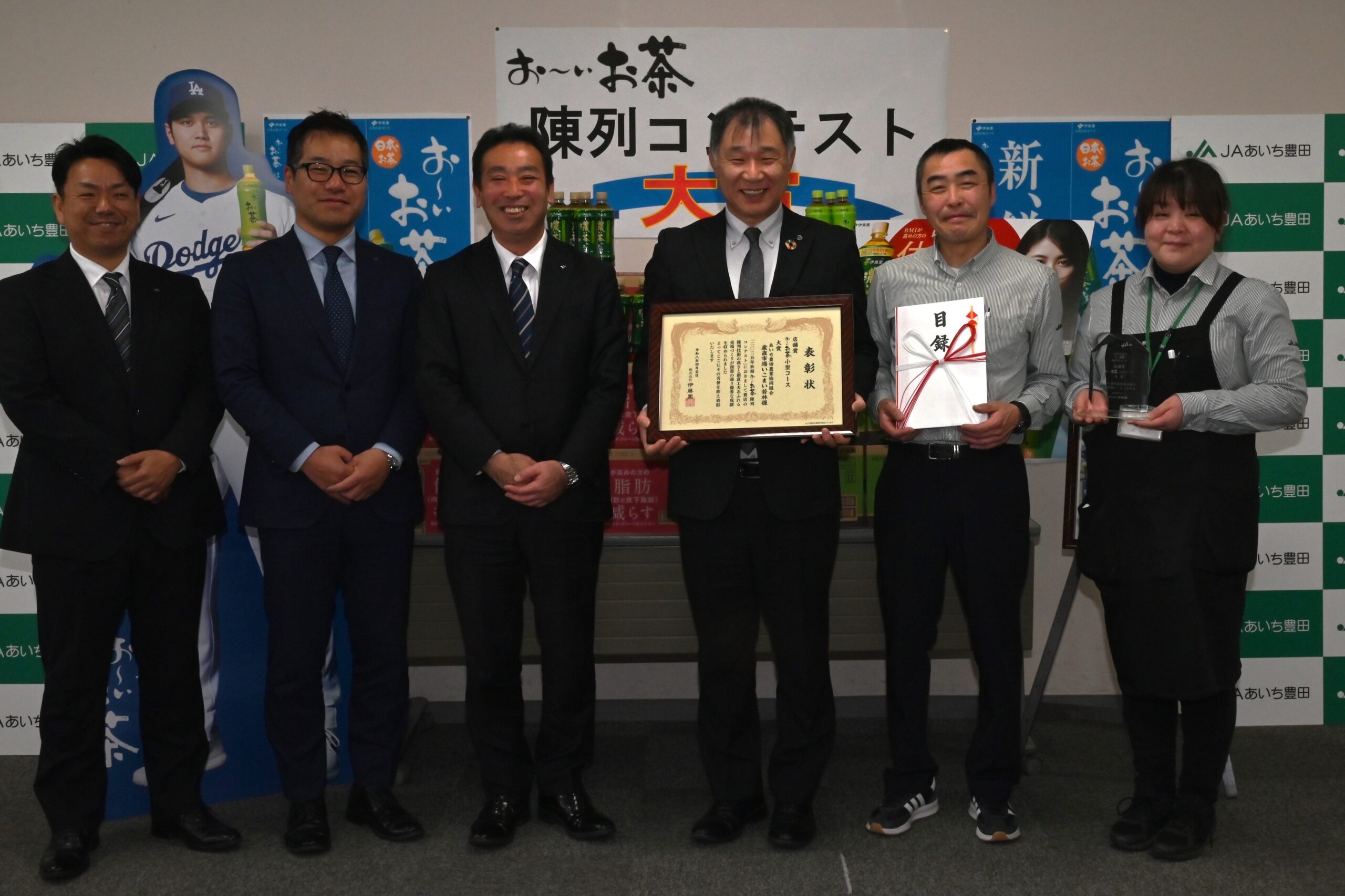 JAあいち豊田産直市場いこまい若林は2月10日、株式会社伊藤園が主催する「2025年秋期おーいお茶陳列コンテスト」の店舗賞おーいお茶小型コースで大賞を受賞し、表彰を受けました。JA長谷川陽一常務理事をはじめ産直市場いこまい若林の山本武史店長と陳列を担当した原田多佳子さんが、同社中部南地区の大野善栄部長からそれぞれ賞状と楯、目録を受け取りました。