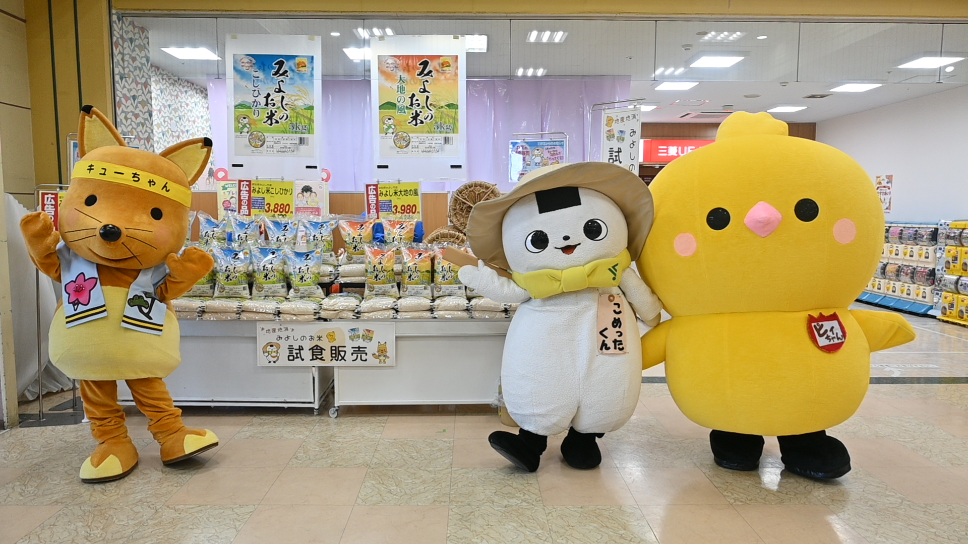 JAあいち豊田は2月21日、トヨタ生活協同組合と連携し、みよし市ひばりヶ丘にあるメグリア三好店の店頭で、米の試食販売イベントを開きました。JA宣伝部長のこめったくんと生協のメグリアすくすく応援 応援隊長のピィちゃん、みよし市健康づくり大使のキューちゃんも参加し、地元産米をPRしました。