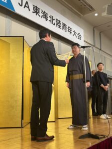 11月21日(金)に、福井県にてJA東海北陸青年大会が開催され、昨年青年の主張の部において最優秀賞を受賞した石川龍樹さんが出席しました。 石川さんの昨年の優れた実績が高く評価されたことで、本大会において功労賞が授与されました。 石川さんは、授与された功労賞について喜びを語るとともに、他の参加者へ向けて励ましの言葉を贈りました。